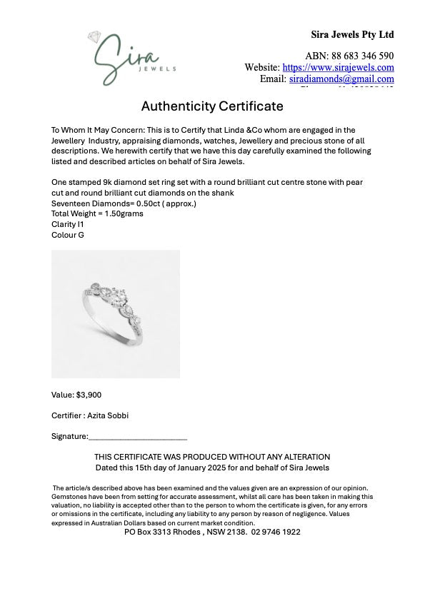Surrounding the center gem are pear cut and round brilliant cut diamonds intricately set along the shank, totaling seventeen diamonds with an approximate weight of 0.50 carats. These diamonds are carefully selected for their I1 clarity and G color, offering a striking balance of sparkle and clarity.