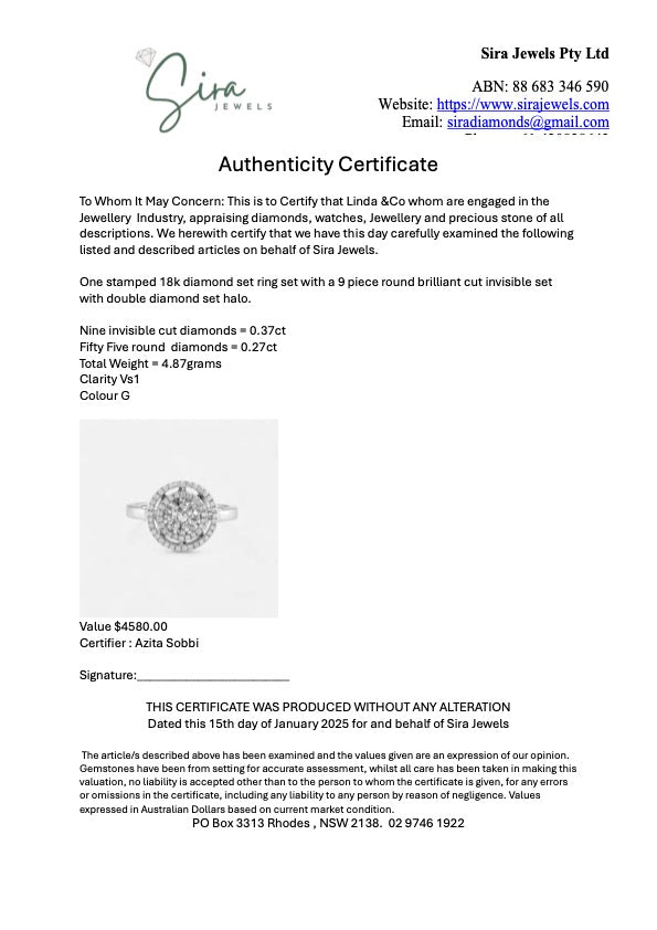 Immerse yourself in the elegance of the Diamond Spiral Halo Ring, a luxurious piece expertly crafted with meticulous attention to detail. This exquisite ring features a central spectacle of nine invisible-set, round brilliant cut diamonds, collectively weighing 0.37 carats, that dazzle with their seamless arrangement.