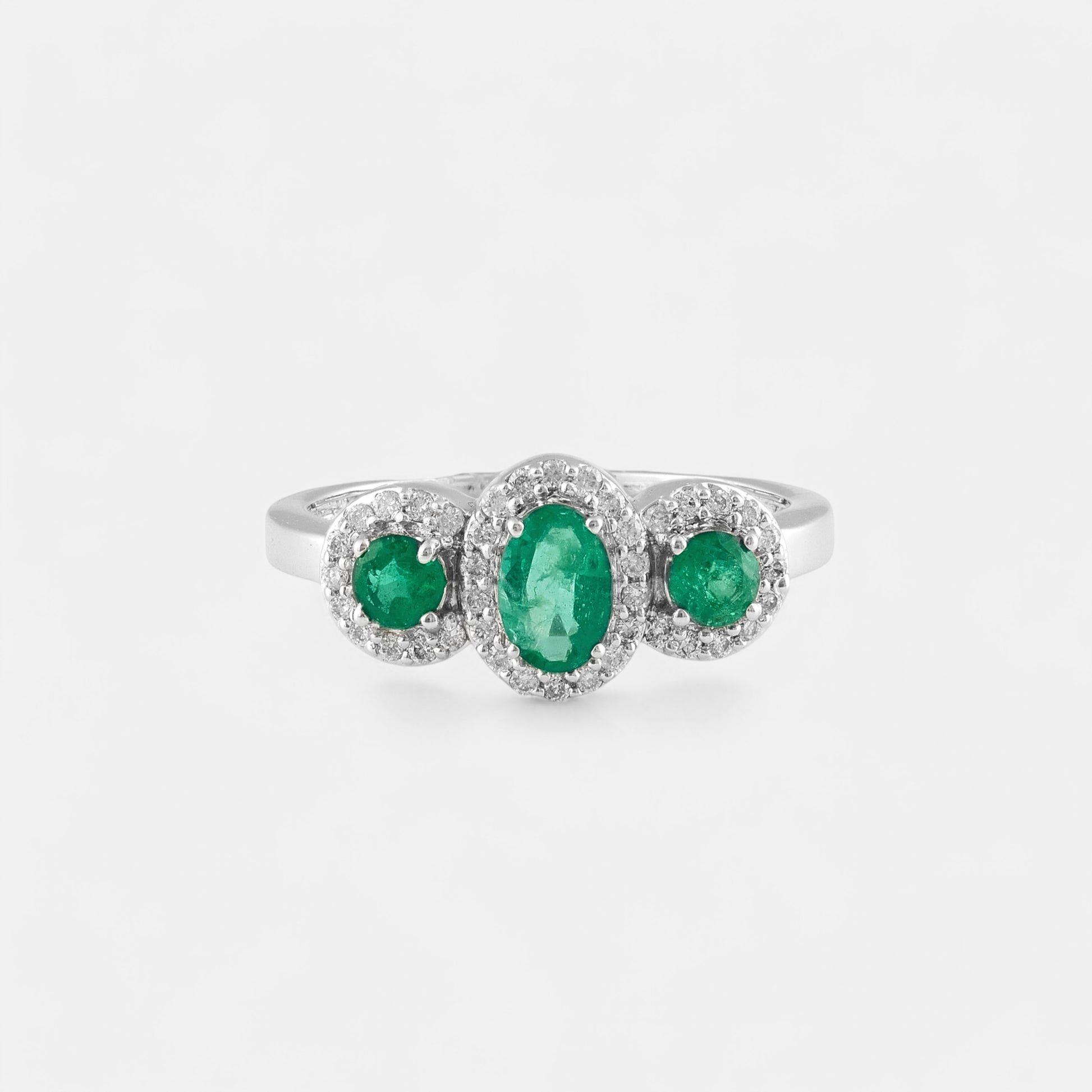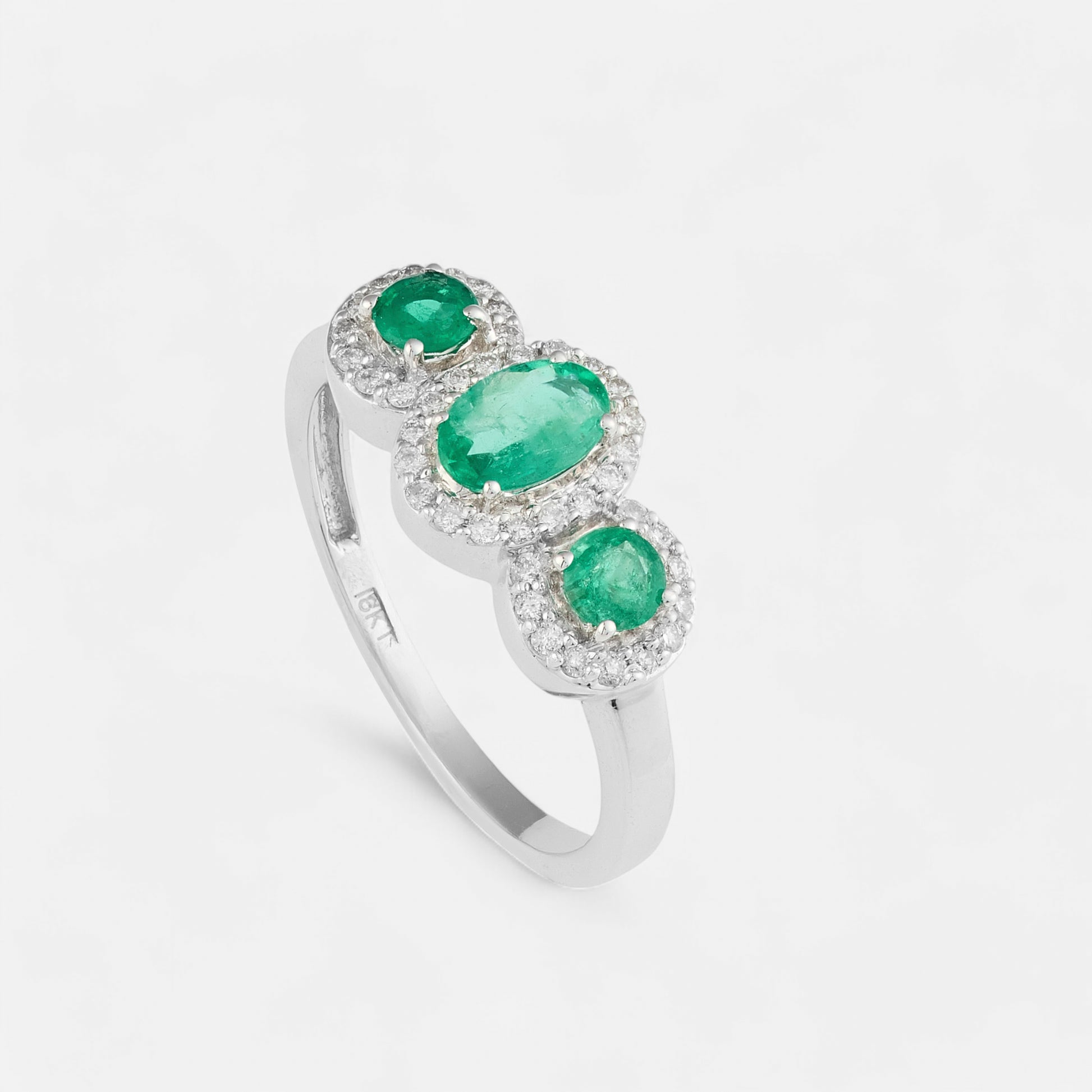 Celebrate timeless elegance with the Emerald Trilogy Halo Ring, a stunning piece symbolizing past, present, and future. This exquisite design features three vibrant oval-cut emeralds totaling 0.59 carats, representing enduring love and harmony. Surrounding each emerald is a delicate halo of 40 naturally sourced round brilliant diamonds, adding 0.20 carats of dazzling brilliance to the design. Crafted in 18-carat white gold, this ring showcases a sleek, modern band that enhances its sophisticated charm. A perfect gift for anniversaries, special occasions, or a meaningful statement piece, this ring embodies classic beauty with a contemporary twist.
