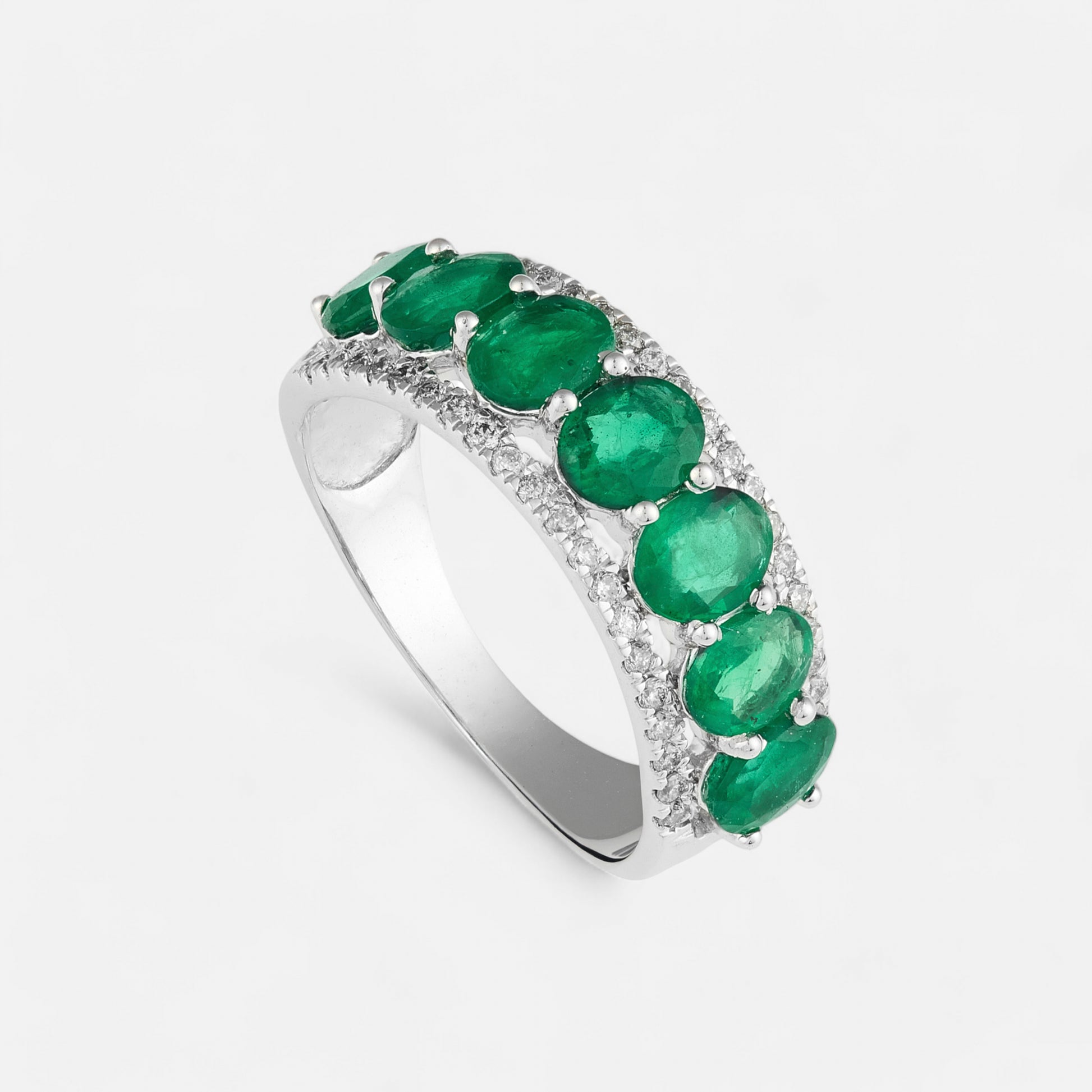 The Emerald Elegance Band Ring is a luxurious piece that showcases the natural beauty of vivid green emeralds, complemented by a stunning diamond halo. Featuring seven oval-shaped emeralds (2.29ct) set in a continuous band design, the ring is further enhanced by 40 naturally sourced round brilliant diamonds (0.26ct), creating a striking contrast of colors. Crafted in 9ct white gold, this ring offers both modern sophistication and timeless elegance. Ideal as an anniversary band or as a statement piece for any special occasion, it promises to add a touch of luxury to any collection.