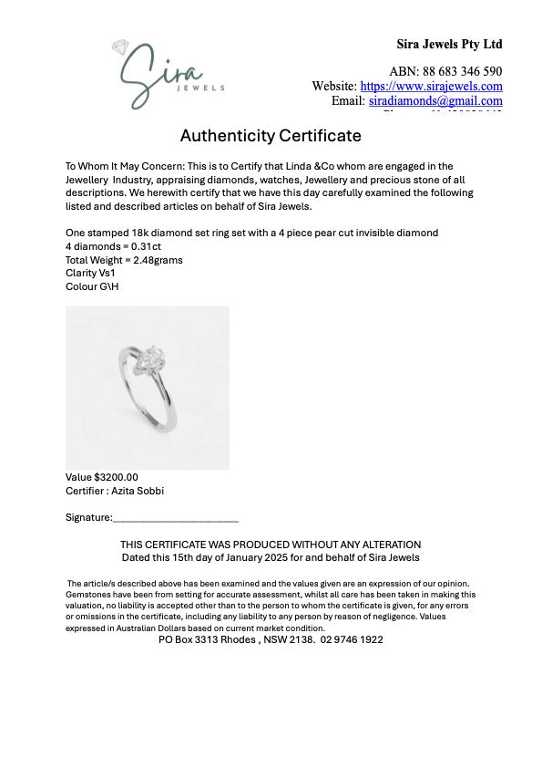 Discover the delicate charm of the Pear Diamond Cluster Ring, a true testament to timeless elegance and craftsmanship. This stunning piece is fashioned from lustrous 18k gold, featuring a cluster of four pear-cut diamonds, artfully arranged in an invisible setting to enhance their natural brilliance.