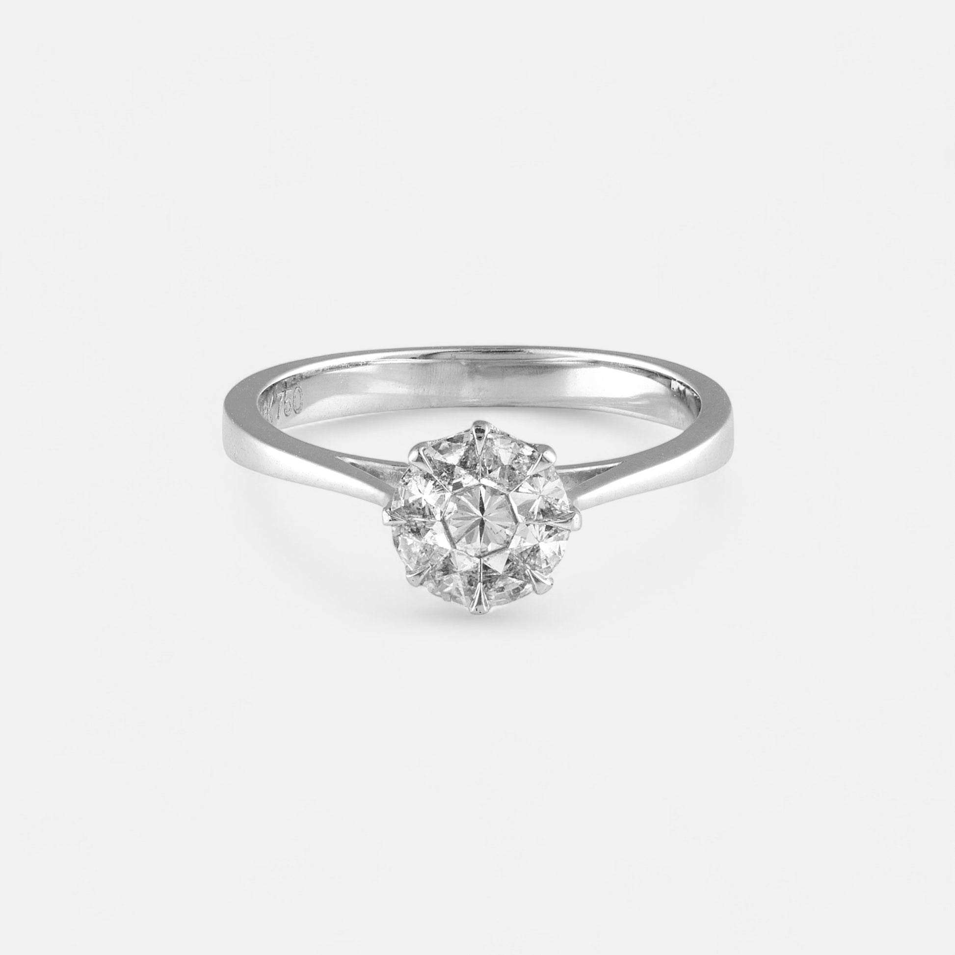 Introducing the Solitaire Diamond Starburst Ring, a radiant expression of modern elegance and sophisticated design. This ring is masterfully crafted from 18k gold, emphasizing a captivating arrangement of nine round brilliant cut diamonds.