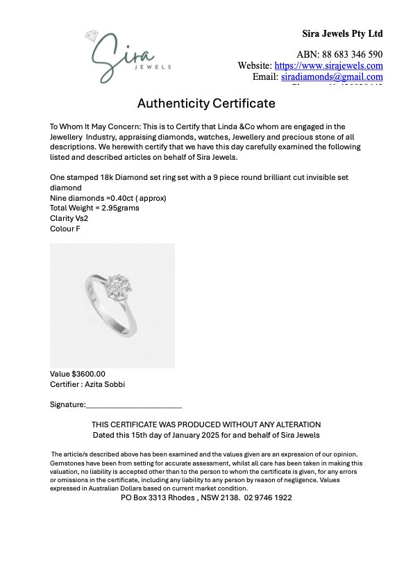 - Number of Diamonds: 9 round brilliant cut diamonds